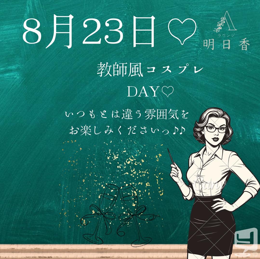 8月23日(土曜日)は教師風 コスプレイベントをします♡ えろかわな女の子達を見に来てね💕🥺 是非 ラウンジ明日香へˏ₍⸜̠̇⸝̠̇₎ˎ ̀⁽⸌̠̇⸍̠̇⁾ ́ˏ₍⸜̠̇⸝̠̇₎ˎ ̀⁽⸌̠̇⸍̠̇⁾ ́