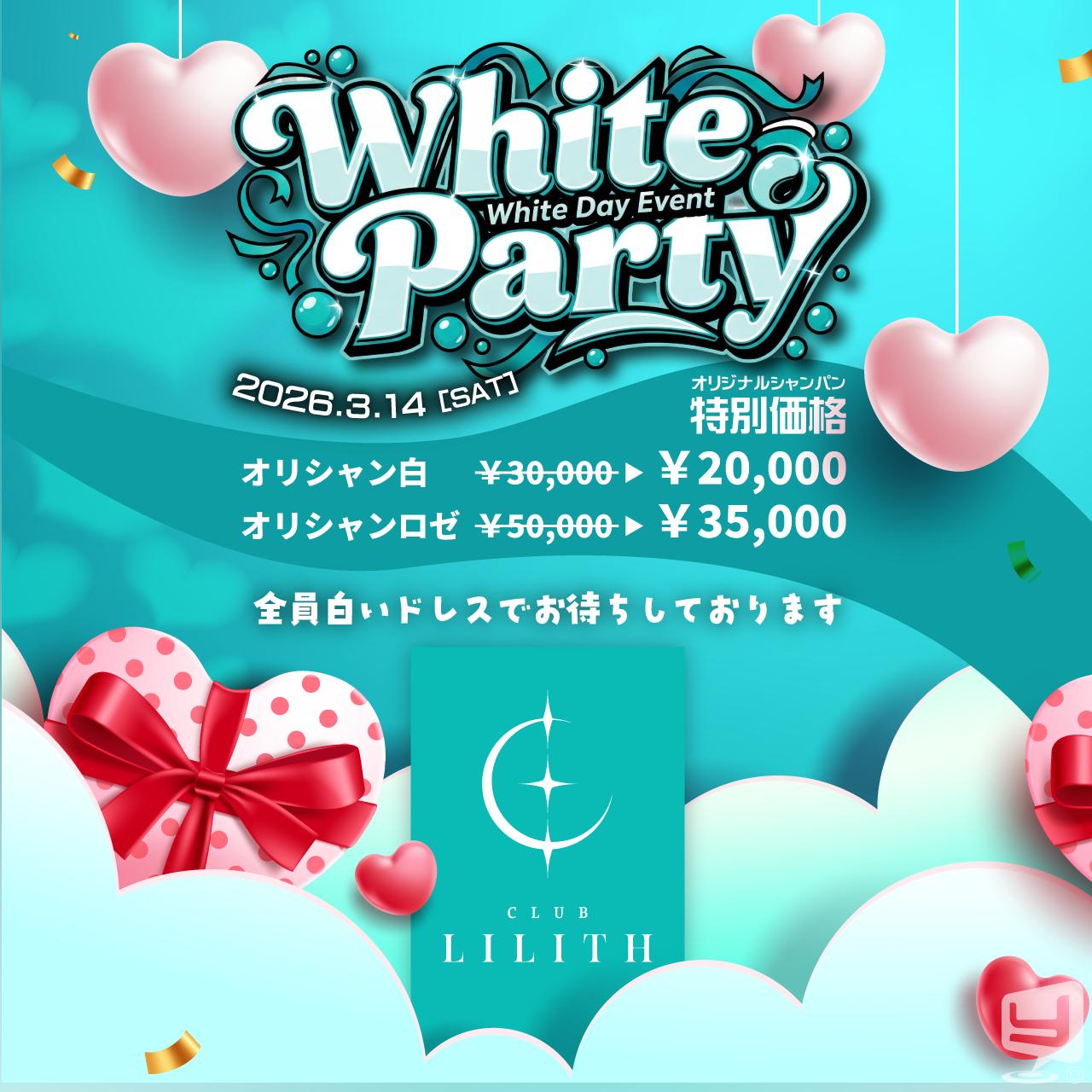 【ホワイトデー イベント】 White Party のお知らせ 3月14日(土) 20:00〜 ホワイトデーにちなんで 『White Party』を開催します✨ キャスト全員『白ドレス』で、みなさまをお出迎え! さらにこの日のみ オリシャンが特別価格となっております🍾 年度末で、お忙しい時期とは思いますが みなさまのご来店、心よりお待ちしております♬